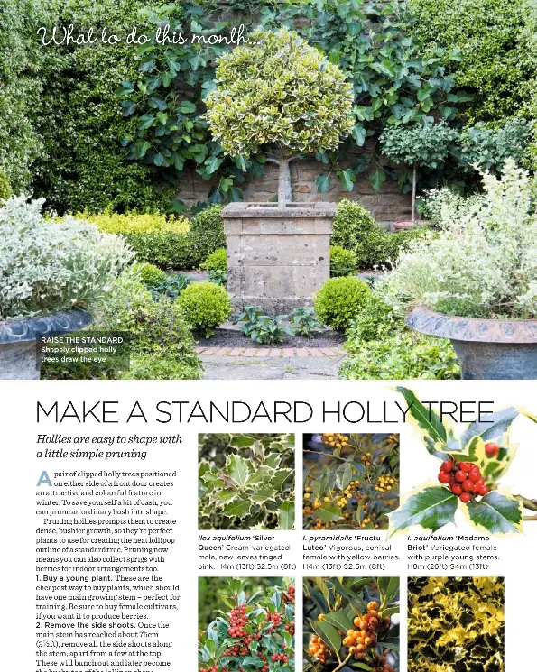 Nellie Stevens Holly Long Leaders 735910 Ask Extension from ask2.extension.org Selective pruning holly shrubs with sharp hand or lopping pruners is always recommended. They're more versatile plants that you might think. Hollies respond very well to pruning and can be formed into a hedge shape or even a loose topiary figure. The spiny, dull green leaves are accented with clusters of red berries which persist throughout the fall and winter. Prune to shape hollies into hedges or to remove dead or diseased growth, or trim the bottom branches off trees to expose the trunk. The key to success is to trim topiary a couple of times a year to prevent any new growth becoming too leggy and spoiling the shape. In fact, december is actually a great time for holly bush pruning. Male and female flowers appear on separate trees and trees of both sexes must be located in the same neighborhood to ensure production of